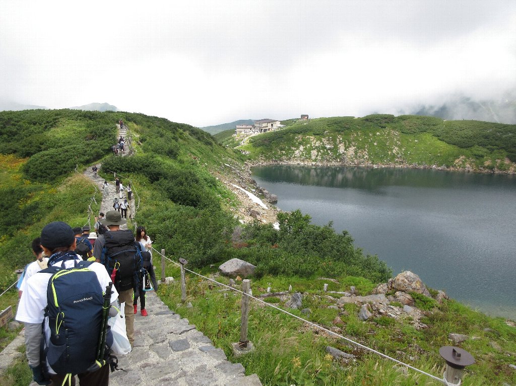 雷鳥沢ヒュッテから、室堂まで”直登”コース。「万里の長城」のような石畳の階段を、周りの山々や、遠くに他チームの行動を眺めながら、ゆっくりと室堂まで移動しました。室堂ターミナルで室堂乗越コースのBチーム①(OB1名、現役部員1名)と合流し、「レストラン立山」で昼食後、「ティーラウンジりんどう」の水出しコーヒーを味わいながら、昔話で盛り上がりました。