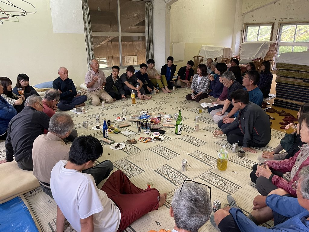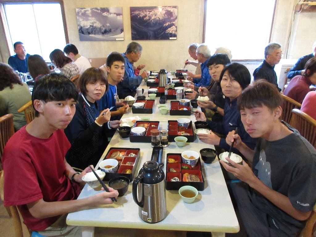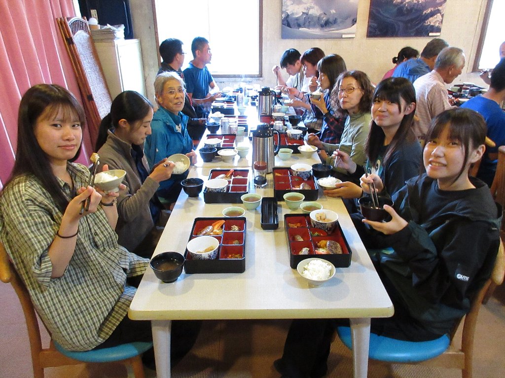 初日の夜の食事の後、大広間をお借りして1時間半ほどのミーティングを行いました。自己紹介やOBの近況報告、現役の活動状況等々のお話をお伺いし、OB・現役とも時代の違い、世代の違いに驚くことも多かったようです。また、来年の山行、再来年の75周年事業に対するご希望や要望も聞かせて頂きました。大学の許可の問題はありますが浄土小屋での宿泊登山、立山三山の縦走等の要望がありました。また役員会で検討し皆さんにお伝えしたいと思います。